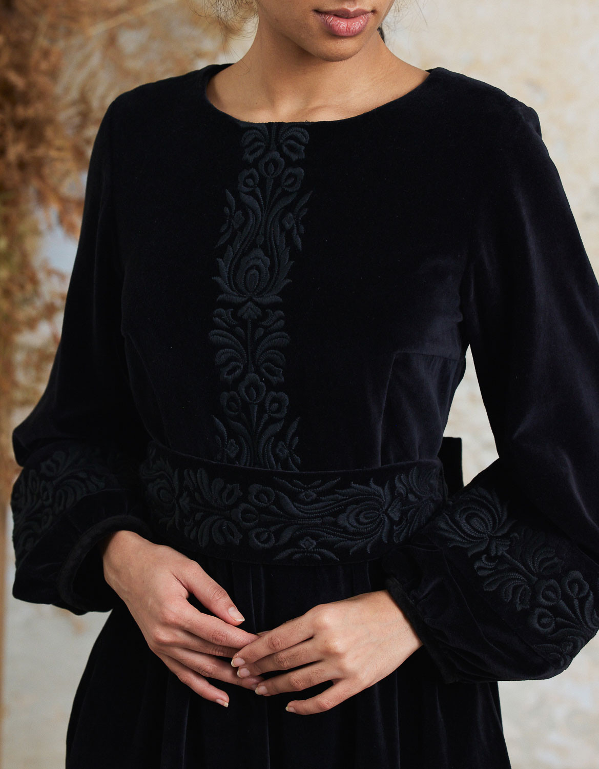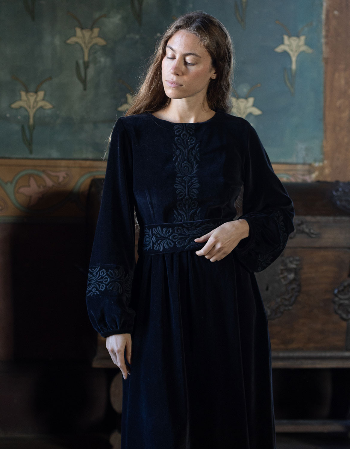 La robe « Misha » est conçue de façon simple, et élégante. Elle arbore de précieuses broderies d’inspiration hongroise sur le devant, et sur le bas des manches bouffantes.
