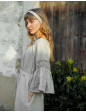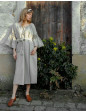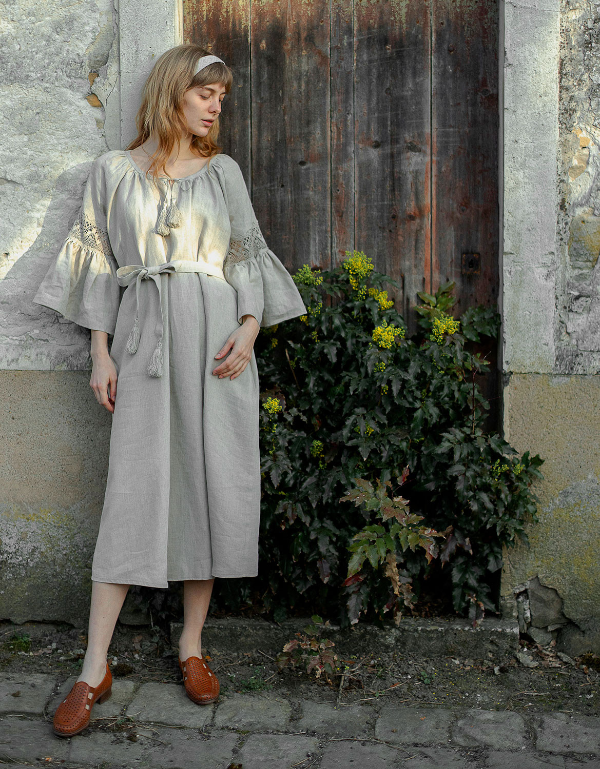 Robe ample de style bohème, décorée de dentelle de lin assortie, accompagnée de sa ceinture et décorée de pompons réalisés à la main en fil de lin. Avec poches.
