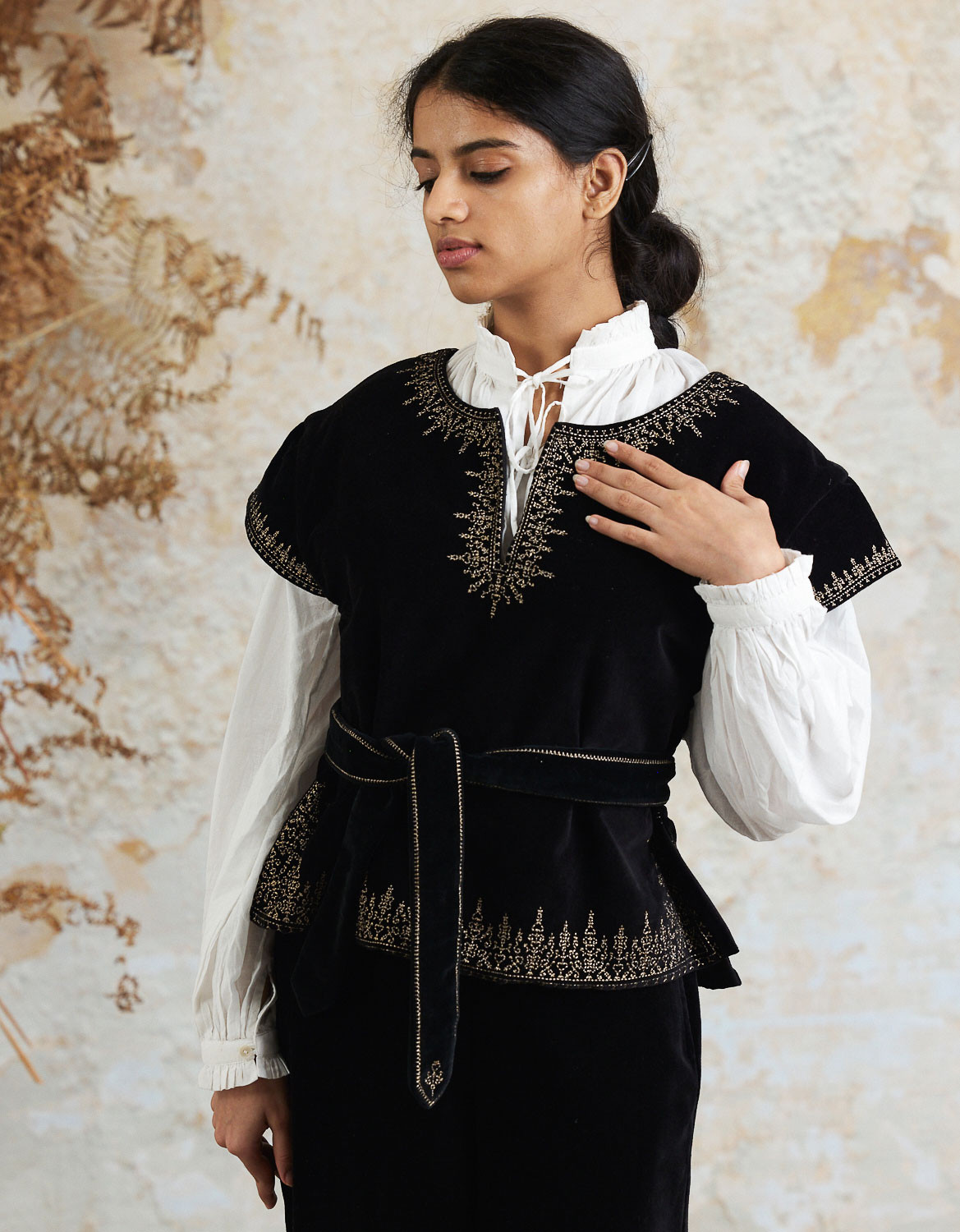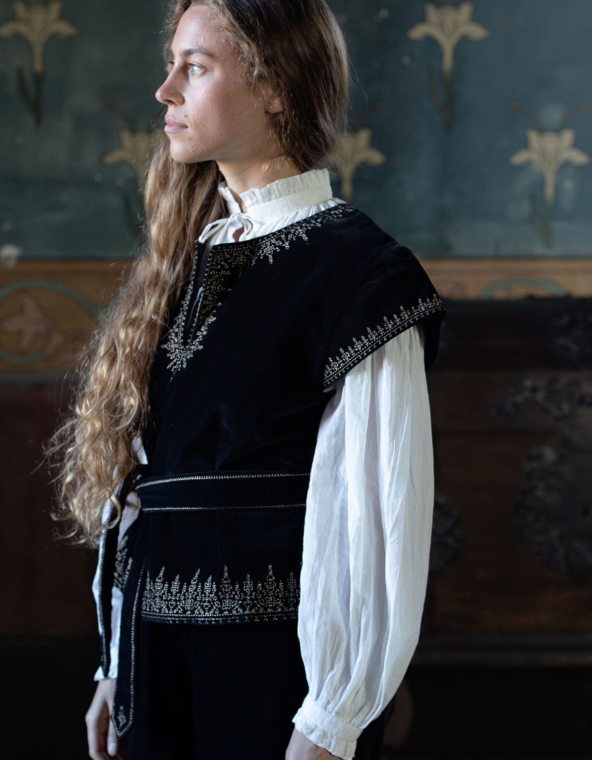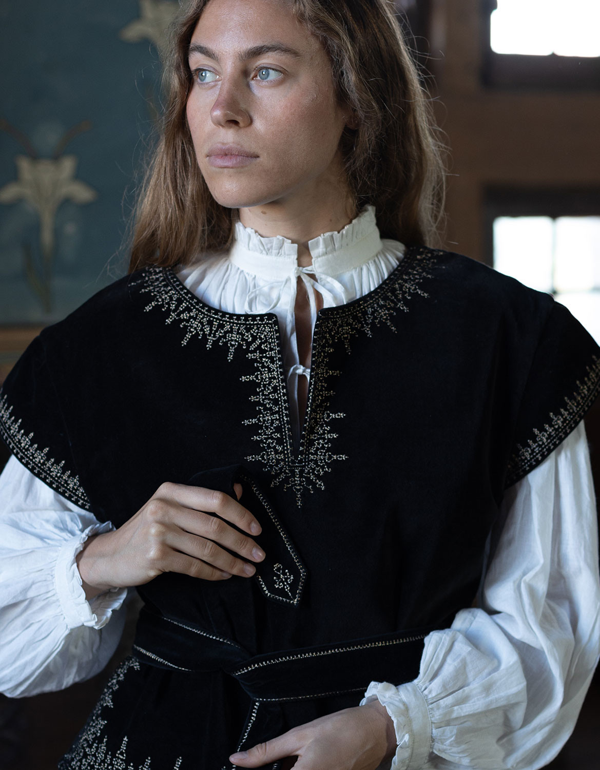 Quatrième membre de la famille Nelda, cette tunique d’inspiration Renaissance a été pensée pour rendre hommage aux tuniques du début de cette époque, tout en apportant les riches détails propres à l’élégance que nous lui connaissons.