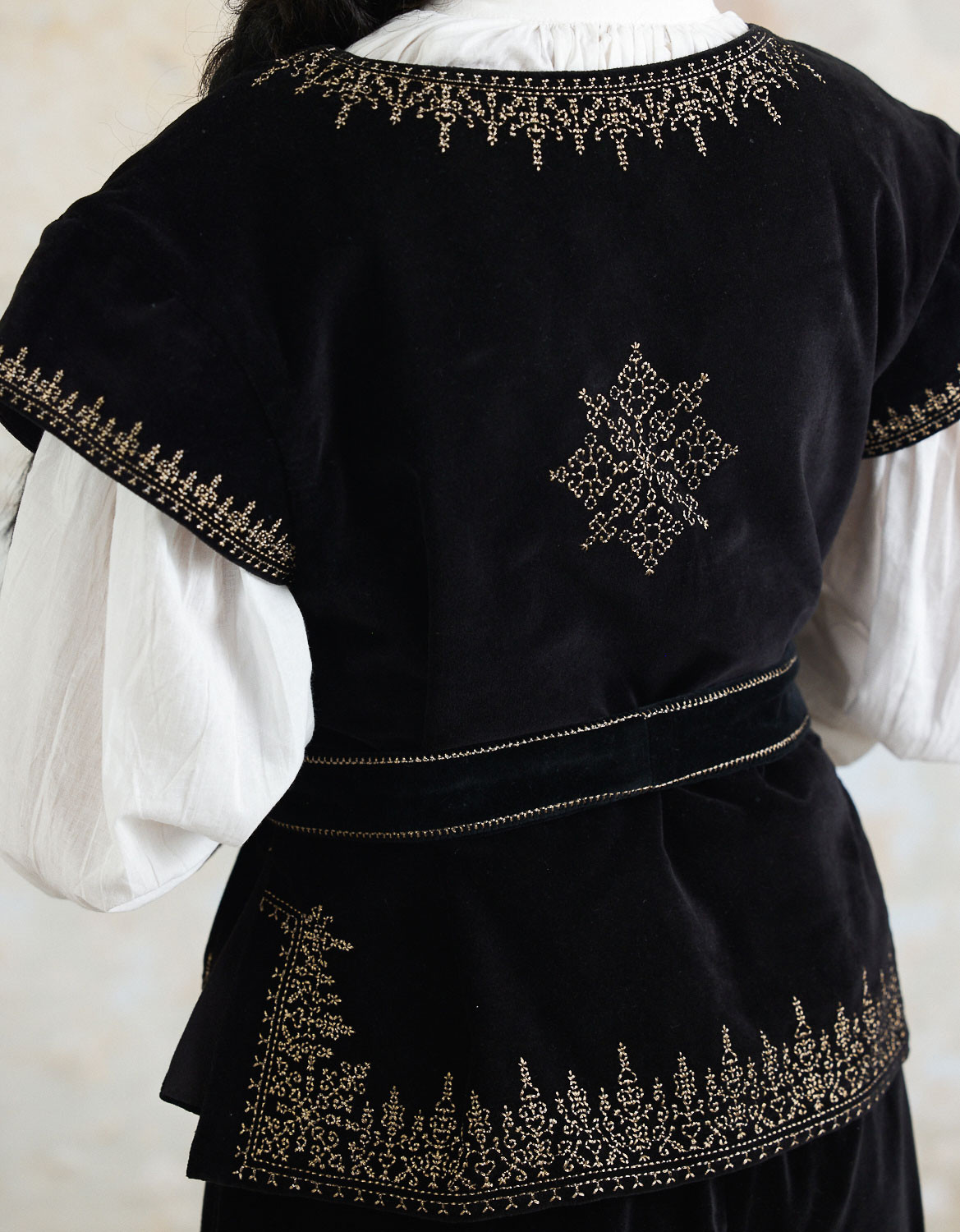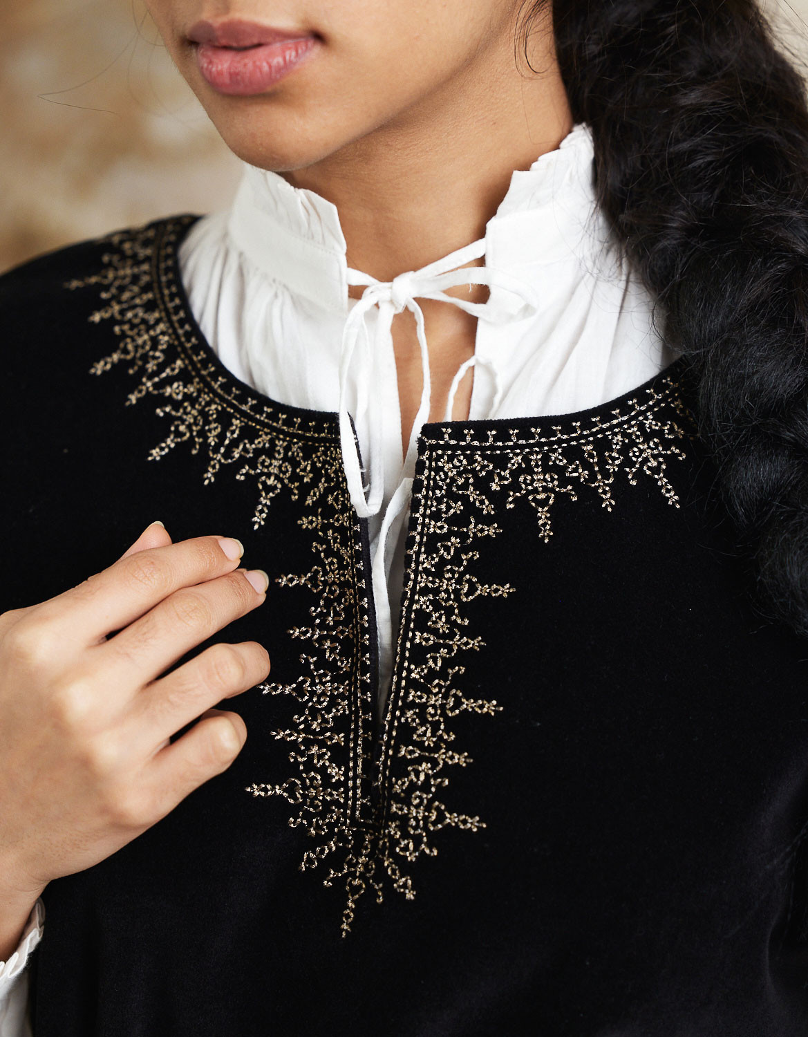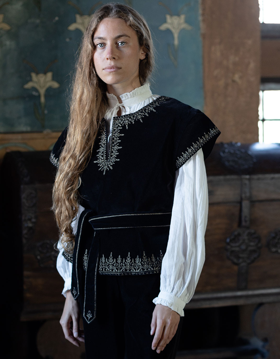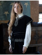 Composée d’un élégant velours de coton, doublé d’un tissu 100% coton de la même couleur, la tunique Nelda a un col rond, fendu au niveau de la poitrine, typique de l’époque, et une ceinture qui vous permettra de mettre en valeur votre silhouette. Vous retrouverez également les délicates broderies dorées qui font tout le charme de la famille Nelda.