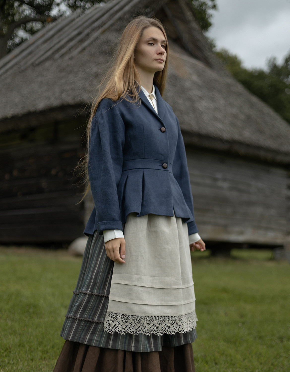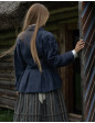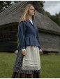 Veste de style folk estonien avec épaules légèrement tombantes avec des plis et un col châle. Se ferme avec deux boutons en simili cuir tressé, couleur châtaigne. Longueur des manches réglages par simple revers grâce à un empiècement interne du même lin.